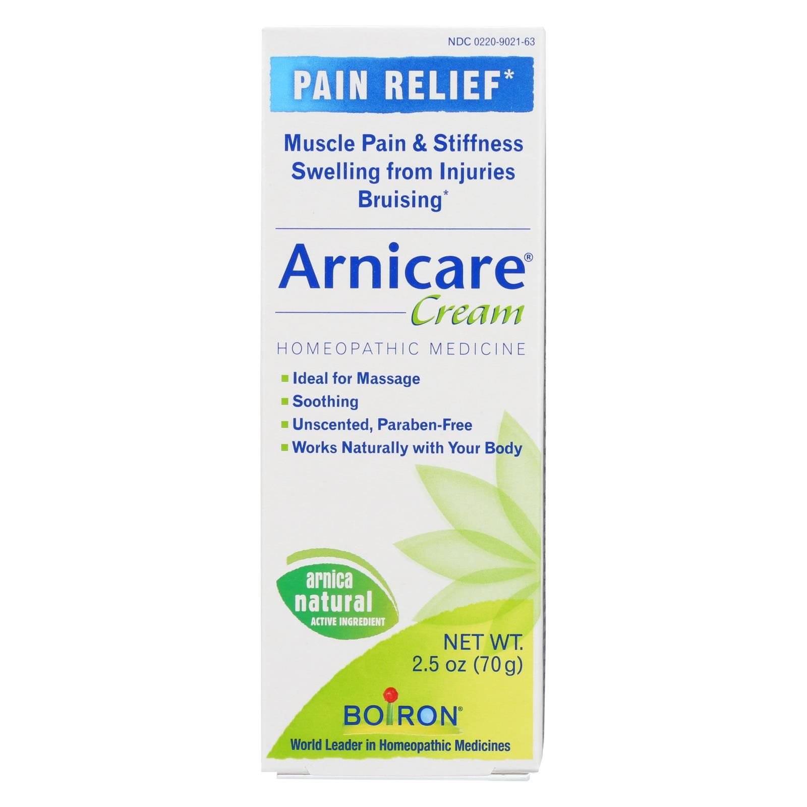 Boiron arnicare cream is a powerful medicinal cream designed to provide natural pain relief. Made with a minimal amount of natural ingredients, boiron arnicare cream is larcreamy free from unnatural and unnecessary additives. This product is homeopathic. This unit of boiron arnicare cream weighs 2.5 oz. See label for warnings.