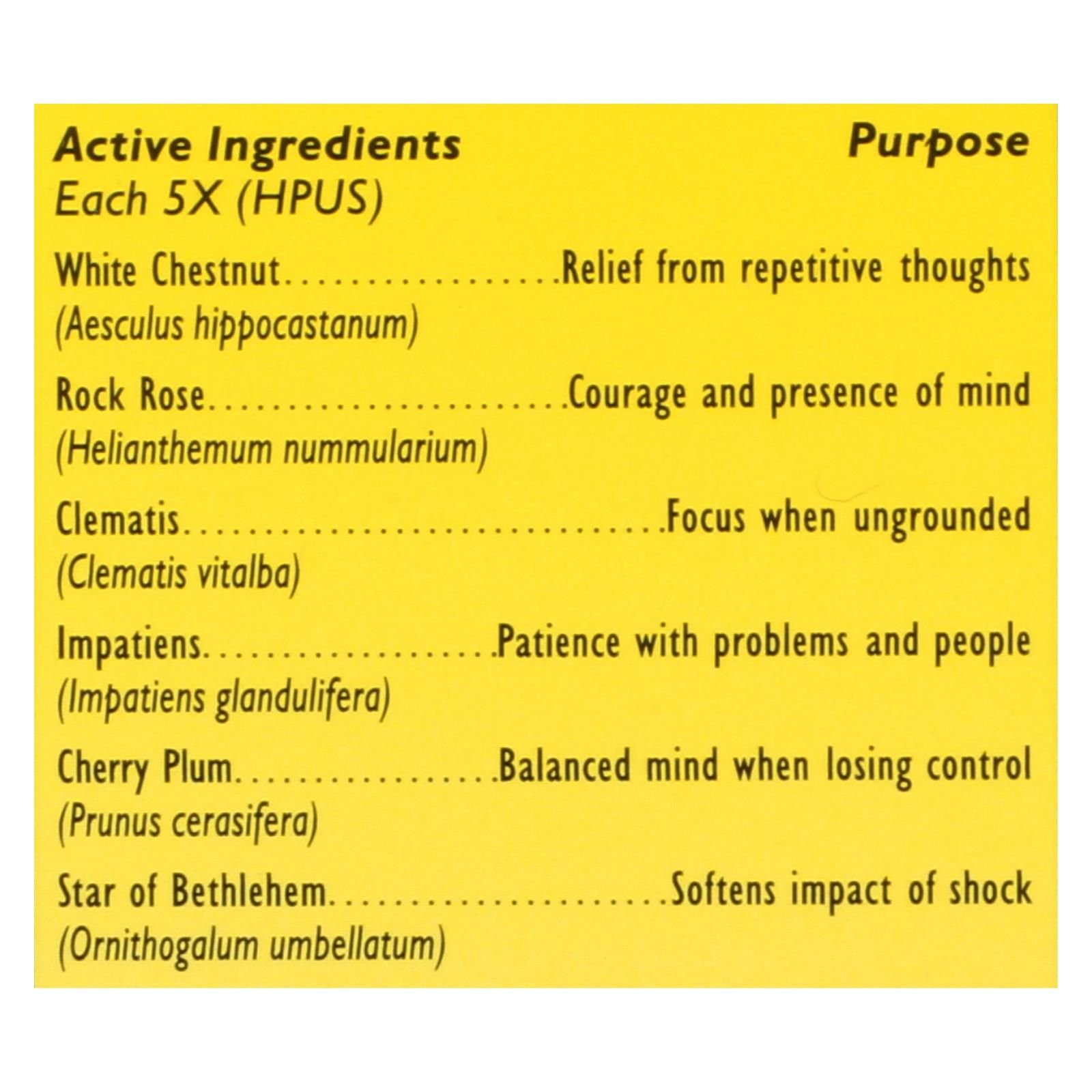ingredients : active each 5x;hpus;white chestnut;aesculus hippocastanum;purpose relief from repetitive thoughts rock rose;helianthemum nummularium;purpose courage and presence of mind clematis;clematis vitalba;purpose focus when ungrounded impatiens;impatiens glandulifera;purpose patience with problems and people cherry plum;prunus cerasifera;purpose balanced mind when losing control star of bethlehem;ornithogalum umbellatum;purpose softens impact of shock inactive ingredient alcohol
