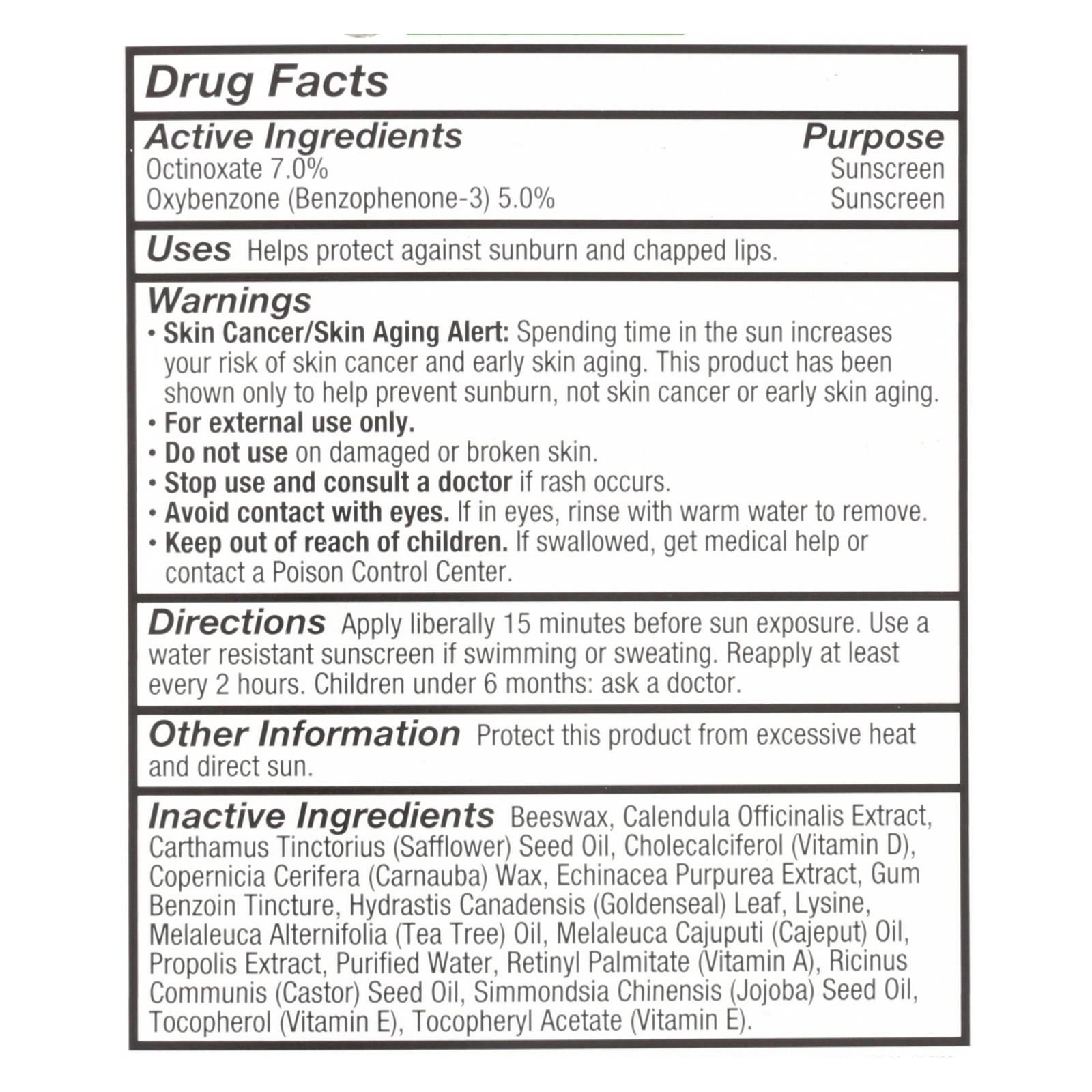 ingredients : active octinoxate 7.0% purpose sunscreen oxybenzone;benzophenone-3;5.0% purpose sunscreen inactive beeswax;calendula officinalis extract;carthamus tinctorius;safflower;seed oil;cholecalciferol;vitamin d;copernicia cerifera;carnauba;wax;echinacea pupurea extract;gum benzoin tincture;hydrastis canadensis;goldenseal;leaf;lysine;melaleuca alternifolia;tea tree;oil;melaleuca cajuputi;cajeput;propolis extract;purified water;retinyl palmitate;vitamin a;ricinus communis;castor;simmondsia chinensis;joj