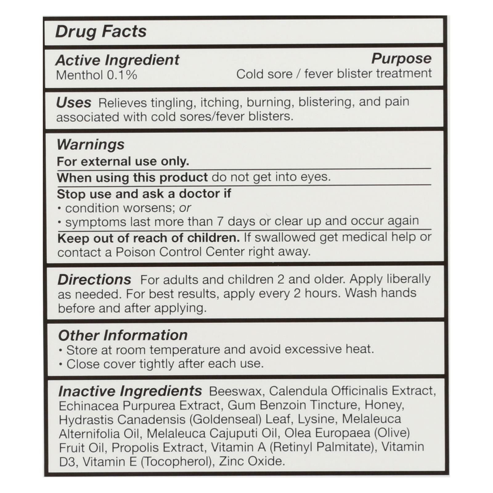 ingredients : active ingredient menthol 0.1% purpose cold sore / fever blister treatment inactive beeswax;calendula officinalis extract;echinacea purpurea extract;gum benzoin tincture;honey;hydrastis canadensis;goldenseal;leaf;lysine;melaleuca alternifolia oil;melaleuca cajuputi oil;olea europaea;olive;fruit oil;propolis extract;vitamin e;tocopherol;zinc oxide